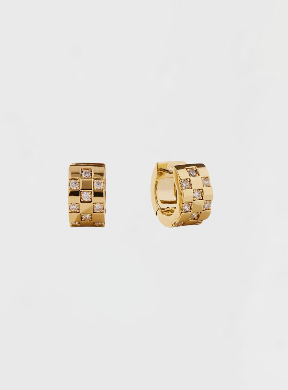 Bold gold huggies adorned with a grid of sparkling crystals, offering a perfect balance of glamour and sophistication. A statement piece that shines with every turn.