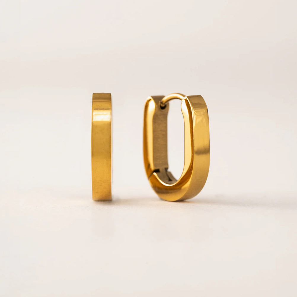 Sleek, squared-off, and waterproof—these 18K gold Maya hoops are your minimalist flex. Like a paperclip, but make it fashion.