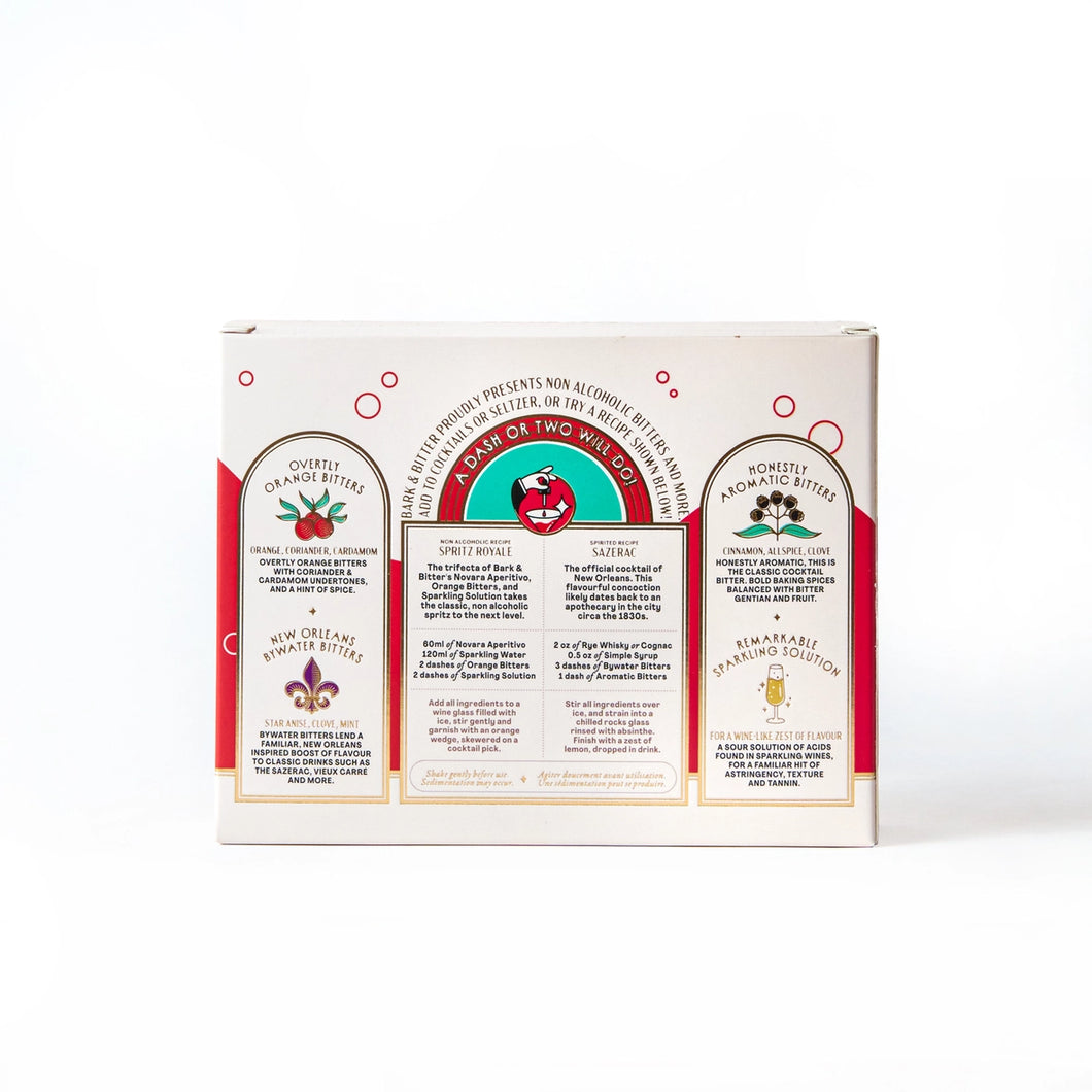 Perfect for gifting! A set of our 3 classic, non-alcoholic cocktail bitters, plus a bottle of our Remarkable Sparkling Solution, in a sample kit perfect for gifting. Contains 4, 30mL (1oz) samples of each of the following: