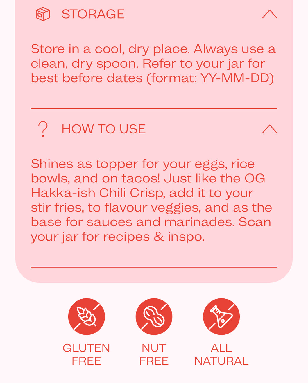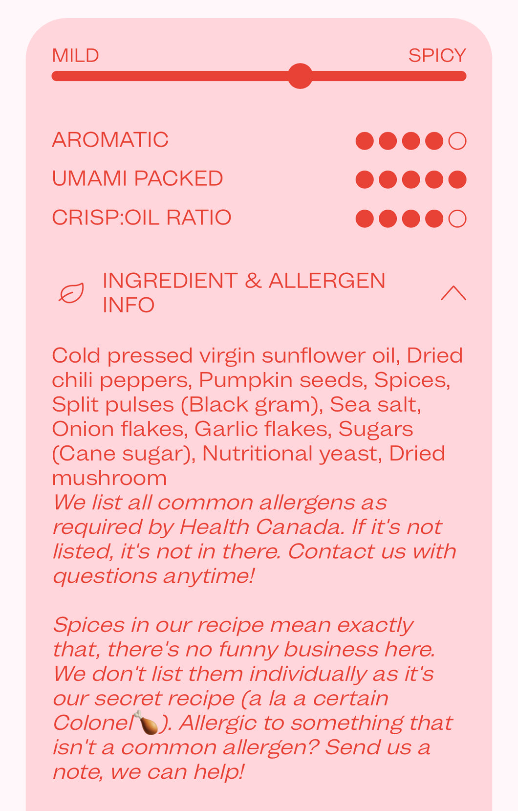 Our all-natural chili crunch has a balanced heat and enveloping umami, with a slight tingle from Sichuan peppercorns! Our addition of warm, earthy spices like cumin and cardamom will guarantee that you'll be intoxicated by the aromas and flavours of this spice market in a jar!