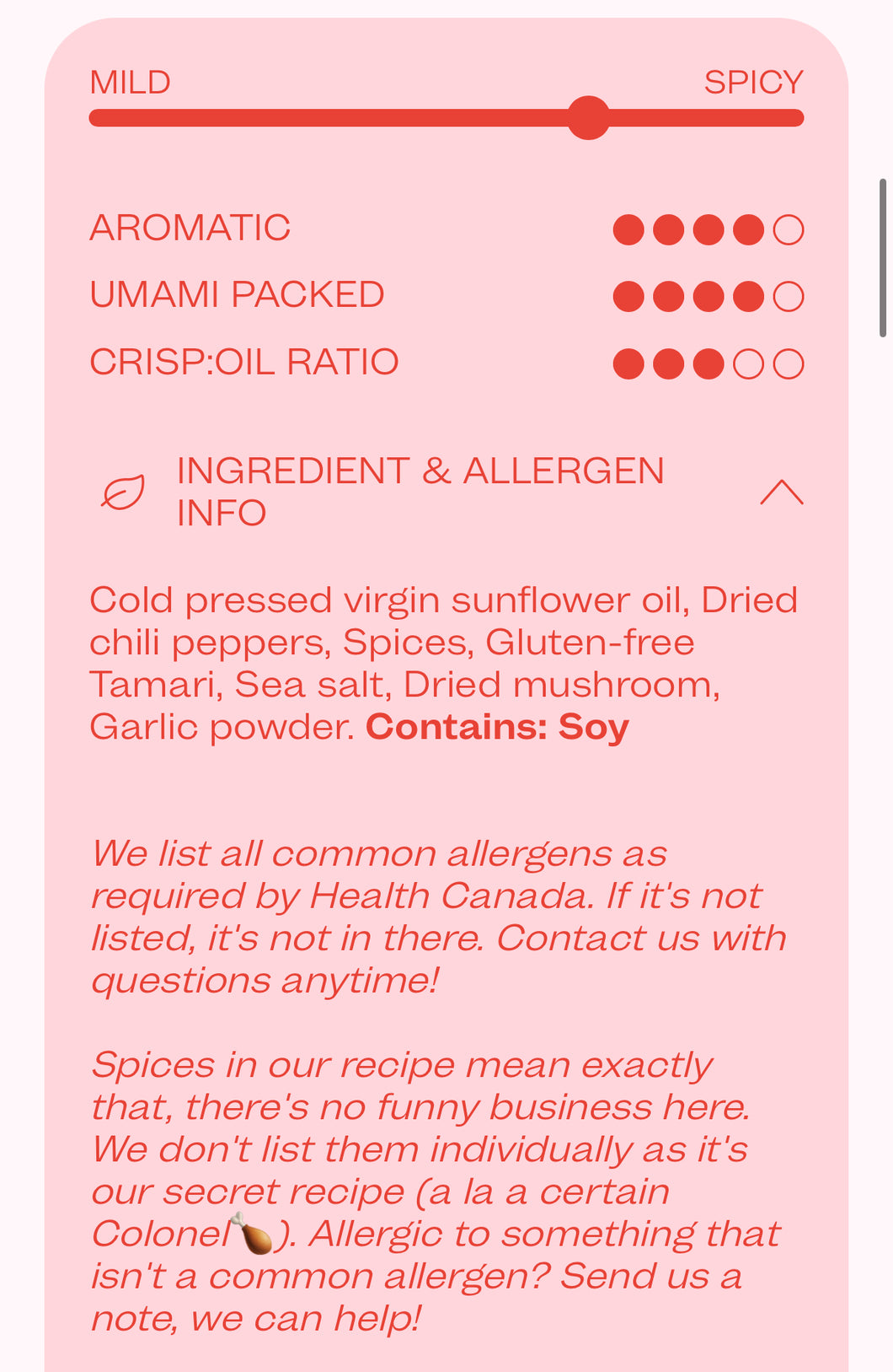 It's not just another Chili Crisp: it is a one-of-a-kind union of Sichuanese and Indo-Chinese cooking (the latter was introduced to the world by the Hakka diaspora living in Kolkata, India.) Our all-natural chili crisp has a balanced heat and enveloping umami, with a slight tingle from Sichuan peppercorns! Our addition of warm, earthy spices like cumin and cardamom will guarantee that you'll be intoxicated by the aromas and flavours of this spice market in a jar! Try it with: stir fries, noodles, as a hot sauce, on your charcuterie board, pizza, eggs, and even on vanilla ice cream!
