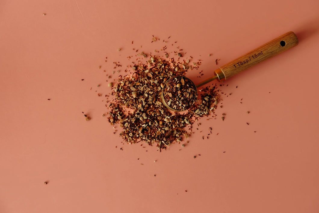 Pairing these two very recognizable and well-loved teas creates a bold, yet decaf cup. The quiet nuttiness of red rooibos relaxes into our rich mix of fennel, anise star, clove, ginger, cinnamon, coriander and peppercorn for the best of both worlds.